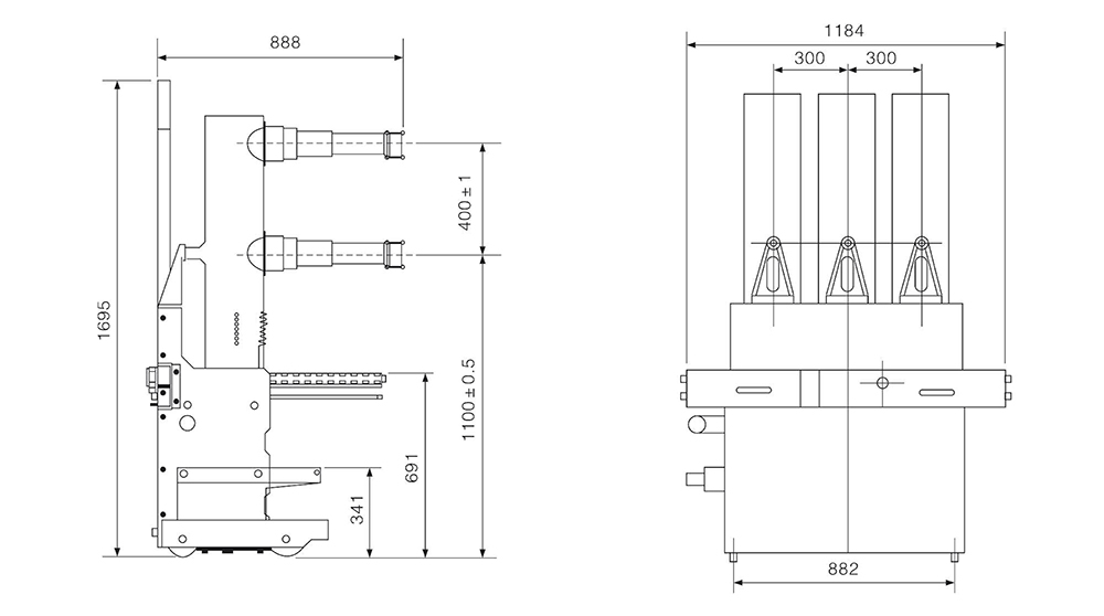 三相灭弧室和相联带电体由三只独立的环氧树脂绝缘筒相隔离,构成复合绝缘结构,断路器满足正常运行条件下的空气距和爬距要求,并有效地减小了断路器的体积。主导电回路真空灭弧室和动静导电联接安装在绝缘筒内,使相间距仅为300mm。主回路电气连接全部采用固定式连接,具有很高的可靠性。绝缘筒安装在断路器框架上方。