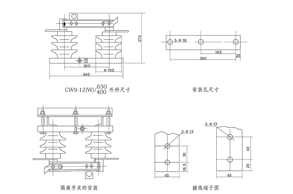 GW9型户外高压隔离开关为交流50Hz的户外高压电器设备,额定电压等级有10kV,15kV,24kV供高压线路在无负载情况下进行开合,以及对被检修高压母线、断路器等电气设备带电的高压线路进行电气隔离之用,也可用于开、合小的电容或电感电流。