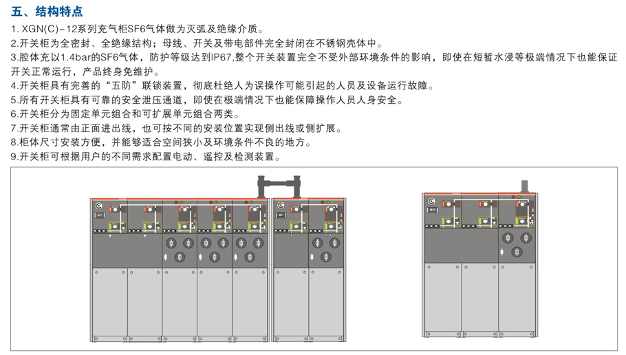 开关柜为模块化单元模式,可根据不同用途进行组合;由固定式单元组合与可扩展型单元两大类,满足各种变电站对紧凑型开关柜灵活使用的需要。HXGN(C)-12型充气式开关柜是一个完全密封的系统,其所有带电部件以及开关封闭在不锈钢的壳体内。整个开关装置不受外部环境条件的影响,从而确保运行可靠性及人身安全,并且实现了免维护。通过选择可扩展母线,可以实现任何组合达到全模块化。扩展母线安全绝缘和屏蔽,确保了高可靠性和安全性。XGN(C)-12型充气式开关柜同时可以提供TV化的自动化解决方案;形成了智能化开关的概念,并将现场安装及调试工作量降到最低。 HXGN(C)-12型充气式开关柜分为非扩展标准配置和可扩展标准配置。由于其具有全模块和半模块的组合性以及自身的可扩展性,因而具有极其特殊的灵活性。 HXGN(C)-12型充气式开关式开关执行GB标准。在室内条件下(20℃)运行的设计寿命超过30年。