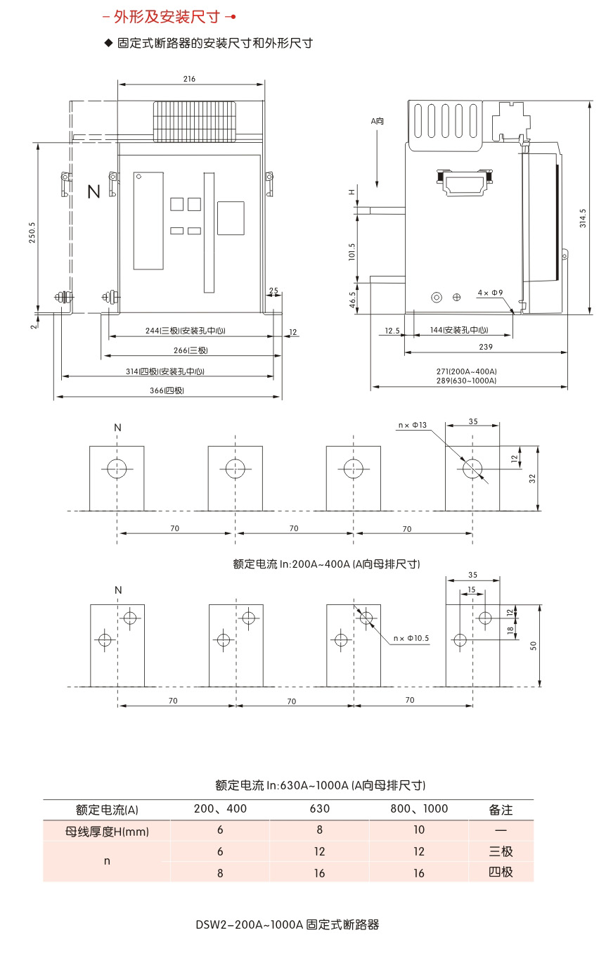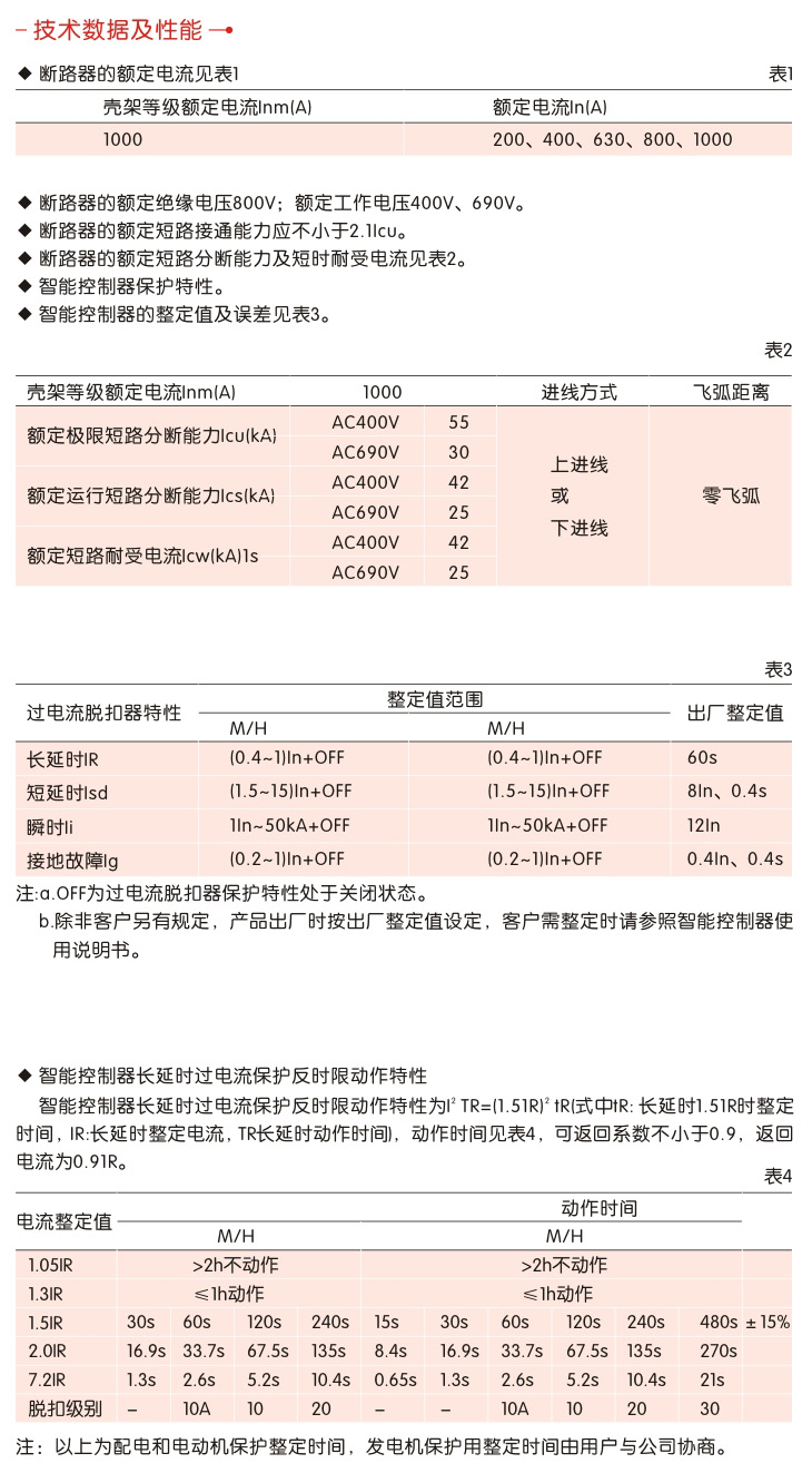 ·脱扣器种类:智能型控制器分励脱扣器、欠电压瞬时或延时脱扣器。