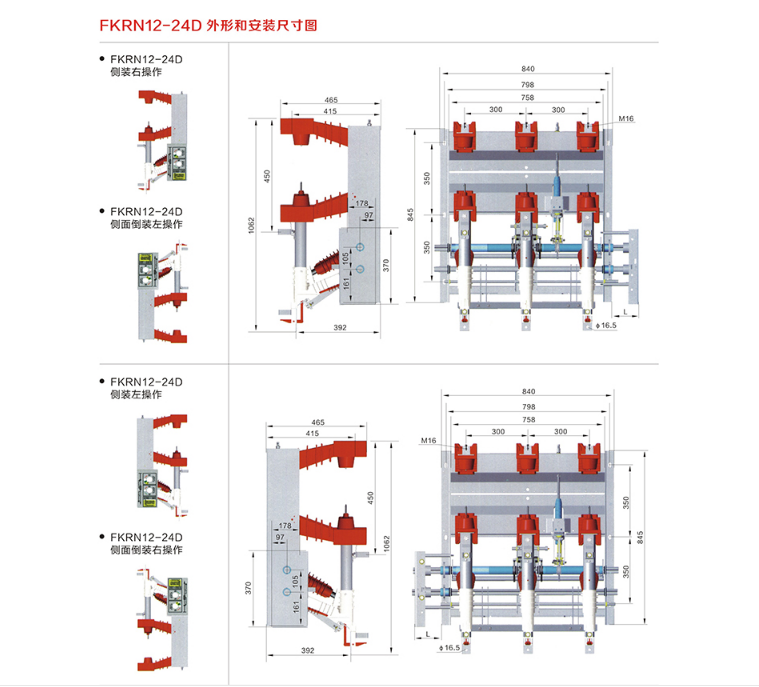 FKRN12-24D系列高压压气式负荷开关及其组合电器为交流24kV, 50Hz的户内高压开关设备,该负荷开关具体技术参数高、动作可靠的特点,操作机构基本形式为手动弹簧储能式,亦可配用电动弹簧操动机构,基于压气灭弧原理,因此可以多次分断,不需更换灭弧管。 高压负荷开关在正常电路条件下,可关合、承载和开断负载电流并具有关合短路电流及在规定时间承载短路电流的能力。 FKRN12-24D系列负荷开关,可以装设接地开关,接地开关具有与负荷开关相同的短路关合能力,以及动热稳定能力,并和负荷开关有严格的机械联锁,在结构上保证不可能出现误操作。