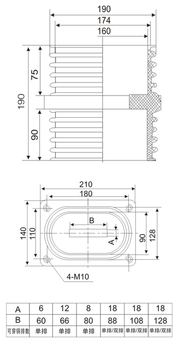 TG3-10Q/110×180穿墙套管适用于额定电压(10~35)kV, 频率(15~60)Hz的三相交流系统电站和变电所配电装置上 ,供导电部分穿过隔板、墙壁或其它接地物,起绝缘支持和外部导线(母线)间固定连接之用。