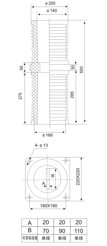 TG3-35Q/180×180  穿墙套管适用于额定电压(10~35)kV, 频率(15~60)Hz的三相交流系统电站和变电所配电装置上 ,供导电部分穿过隔板、墙壁或其它接地物,起绝缘支持和外部导线(母线)间固定连接之用。