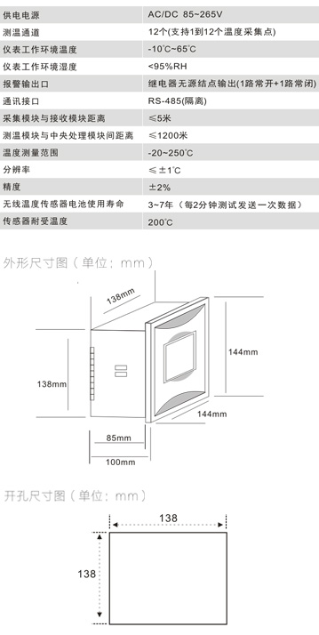 FIKW3000电气接点温度在线监测装置是我公司借鉴国内外同类产品为保证电力电器良好的运行环境,针对电气设备接点部位由于材料老化、接触不良、电流过载等因素引起的温升过高的故障隐患,自行研制开发的能够及时监测到电气接点温度的在线监测装置。该产品采用低功耗设计、无线测温等技术,具有隔离彻底、安装方便、抗干扰能力强、工作可靠等特点,能很好的解决高电压状态下的温度测量问题。该产品主要应用于高压开关柜触头及接点、刀闸开关、高压电缆中间头、干式变压器、低压大电流柜等设备的温度监测。保障自动化作业的高效、安全运行。