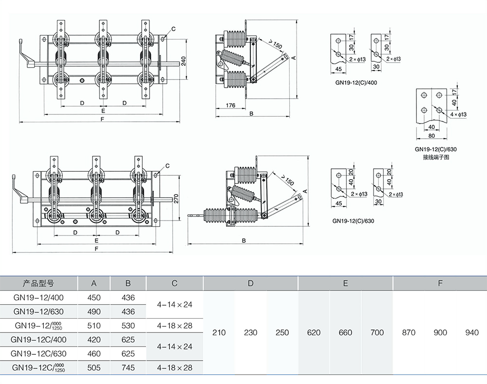 GN19-12型户内高压隔离开关系高压开关设备,用于额定电压12KV,交流50Hz及以下电力系统中,配用CS6-1型人力操作机构,作为在有电压而无负载的情况下,分,合电路之用,亦有派生产品防污型,高原型的和加装带电显示装置等。