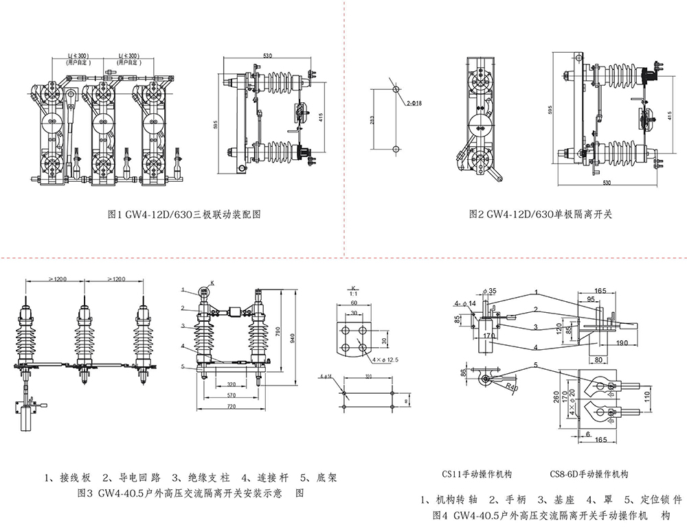 隔离开关为单极型,也可通过连杆将三极连成能够联动的三极型式。配用CS11型或CS8-6D型手动机构操作。