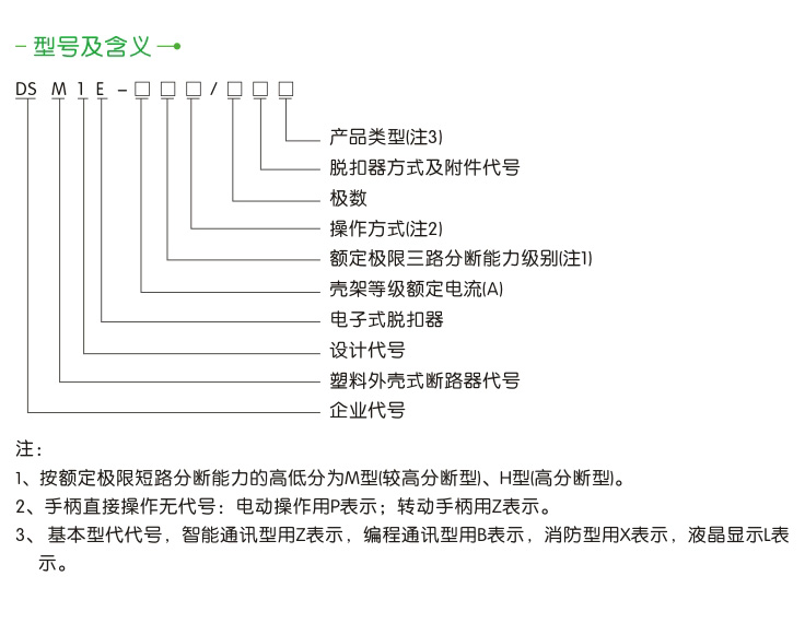 -断路器符合标准·IEC60947-1及GB14048.1《低压开关设备和控制设备总则》。·IEC60947-2及GB14048.2《低压开关设备和控制设备低压断路器》及附录F《带电子过电流保护断路器的附加要求》。◆IEC60947-5.1及GB14048.5《低压开关设备和控制设备控制电路电器和开关元件》。-主要功能及特点一智能控制器是塑壳断路器的核心部件,应用于电动机保护或者配电保护,实现测量、保护、控制和通信功能于一体,使线路和电源设备免受过载、短路、接地等故障危害。·采用MCU微处理器控制,性能稳定可靠:该智能控制器能自供电源,只要一相通电,当电流不低于其额定值的20%时,都能确保保护功能正常工作。·选择性配合具有三段保护:使用类别为B类的断路器与连接在同一电路中的其他短路保护装置在短路条件下具有选择性配合;过载长延时反时限短路延时(反时限、定时限)、短路瞬时等保护功能参数的整定。·具有动作电流、动作时间三段保护参数设置,可进行4-10档调整:用户可根据负载电流要求对控制器进行设置调整,也可根据用户要求选择关断相应功能(定制功能,需用户定货时注明)。大电流瞬时脱扣功能:当在断路器闭合时,或在运行时,如遇到短路大电流(≥20lnml,断路器磁脱扣机构可直接脱扣,双重保护更加可靠安全。·具有脱扣测试(试验)功能:输入直流DC12V电压试验断路器动作特性。故障自诊断功能:对智能控制器自身的工作状态和运行隋况进行保护和检测。·具有预报警指示、过载指示:当负载电流达到或超过设定值时相应导光柱导出光源。◆磁通变换器双气隙技术:工作更可靠稳定,杜绝误动作、脱扣可靠、功率微小。·保护精度高:过载保护、短路短延时保护动作时间精度±10%;短路瞬时保护动作值精度为±15%取决于动作电流。·安装具有互换性:外形尺寸安装尺寸与DSM1系列塑壳式断路器同规格尺寸相同(注:其中DSMIE-630与DSM1-800相同)。