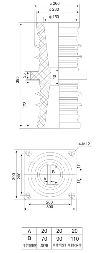 TG3-35Q/260×260  穿墙套管适用于额定电压(10~35)kV, 频率(15~60)Hz的三相交流系统电站和变电所配电装置上 ,供导电部分穿过隔板、墙壁或其它接地物,起绝缘支持和外部导线(母线)间固定连接之用。
